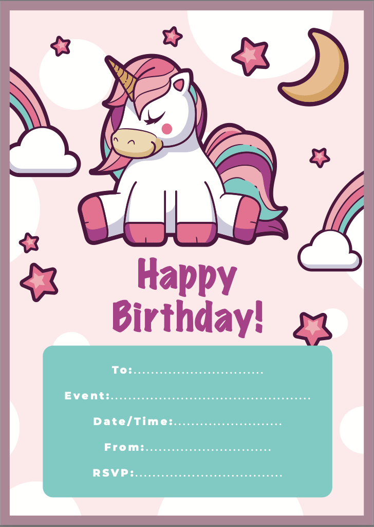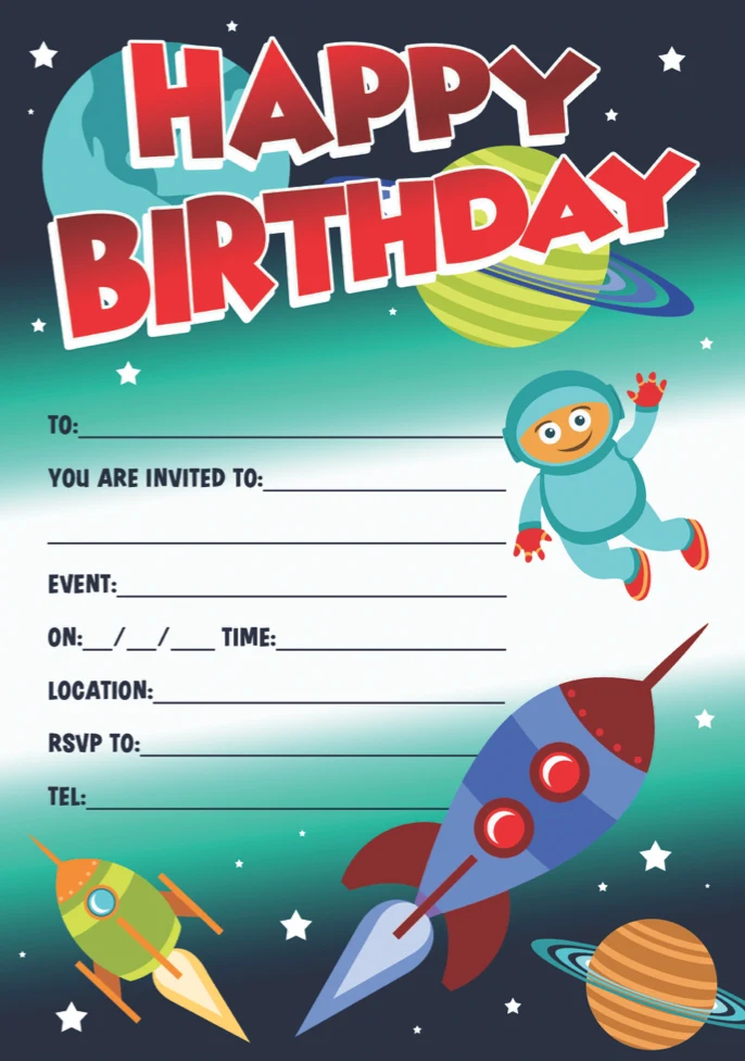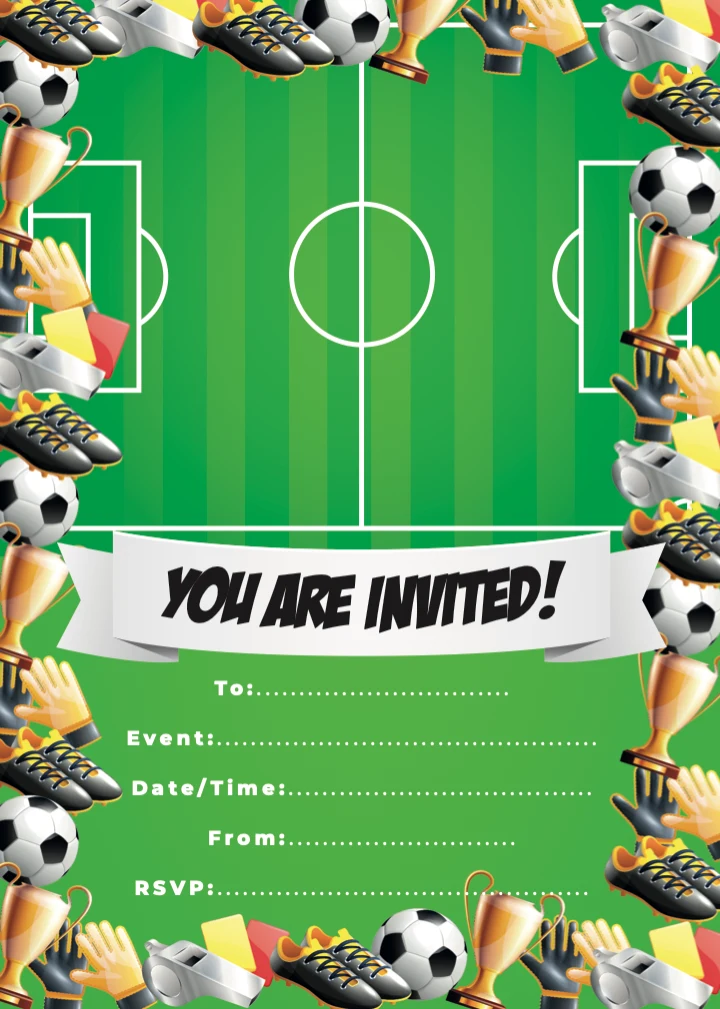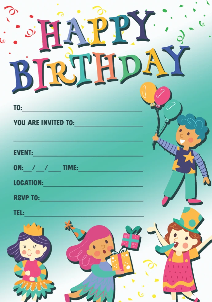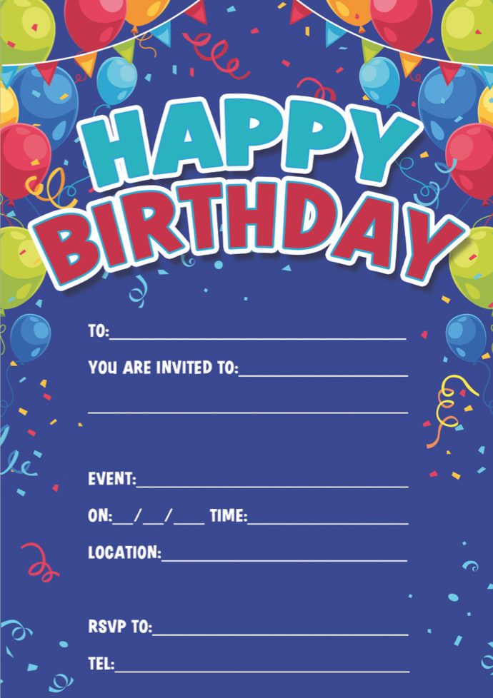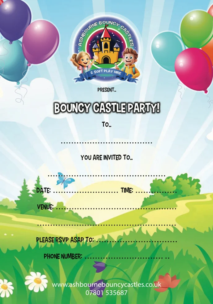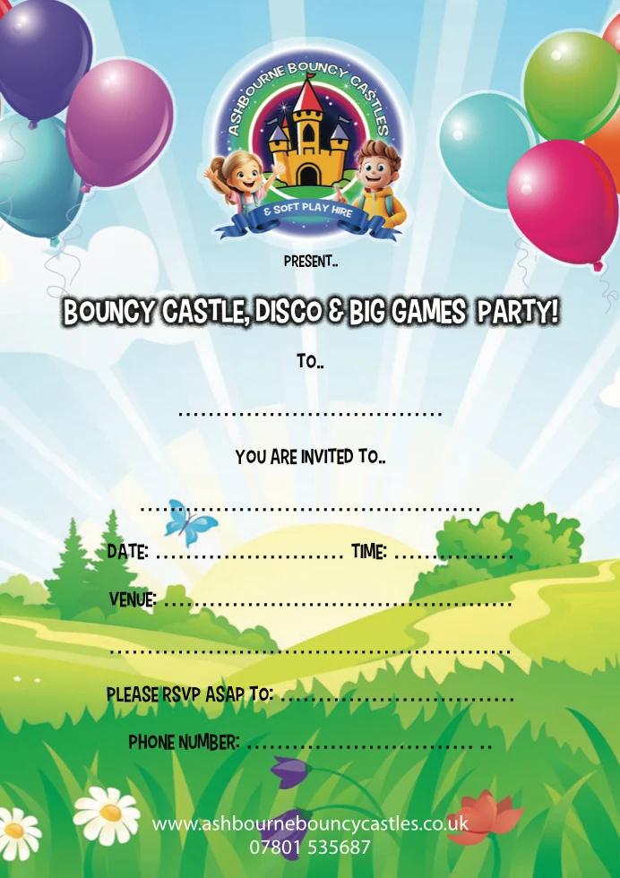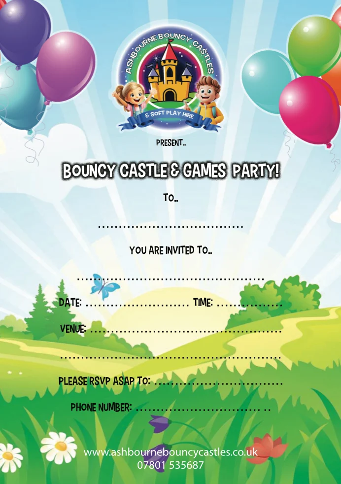 If you wish we can personalise your party invitations (example pictured on the right) We'll add the birthday child's name, the date, times, the venue, name of the person to RSVP to and their contact number. The only thing you will need to add is the name of each child you are inviting along to the party.
