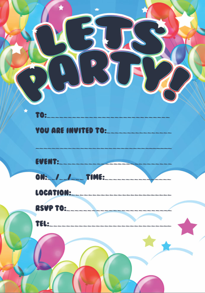 Our party invites are FREE for you to use. There's one for each of the packages we offer, so look for the one you need and download it. The downloaded file is a PDF and suitable for print in A5 size, you will be able to print 2 invitations per a single A4 piece of paper depending on your printer settings.