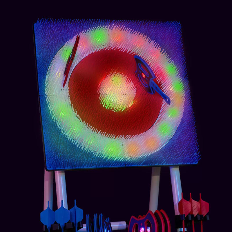 This is great fun for all ages of children and adults. It can be hired for outdoor use and indoor use and if it's dark it lights up too! There's 2 sets of axes and 2 sets of darts also so 2 games in one.