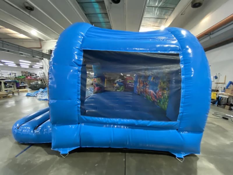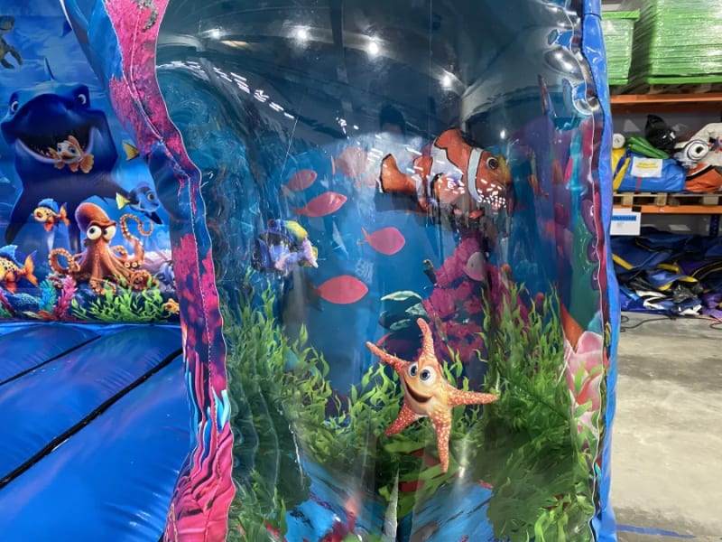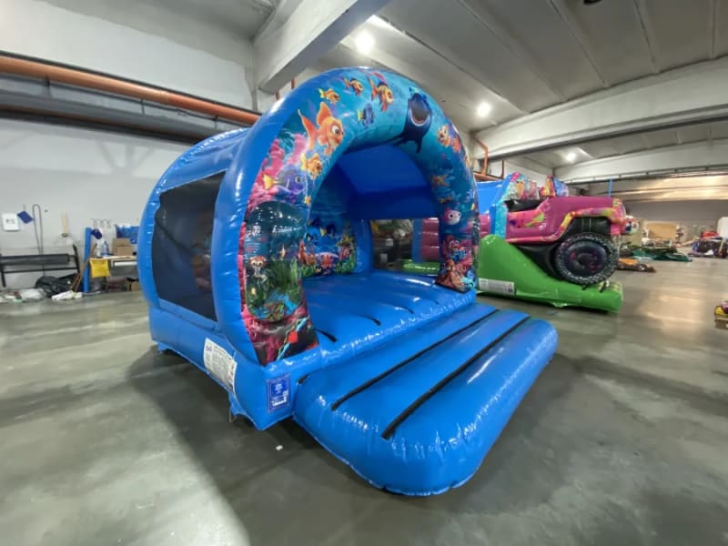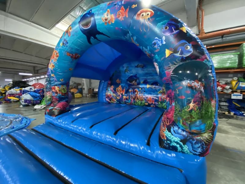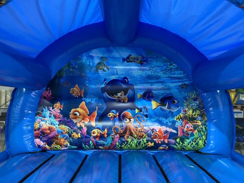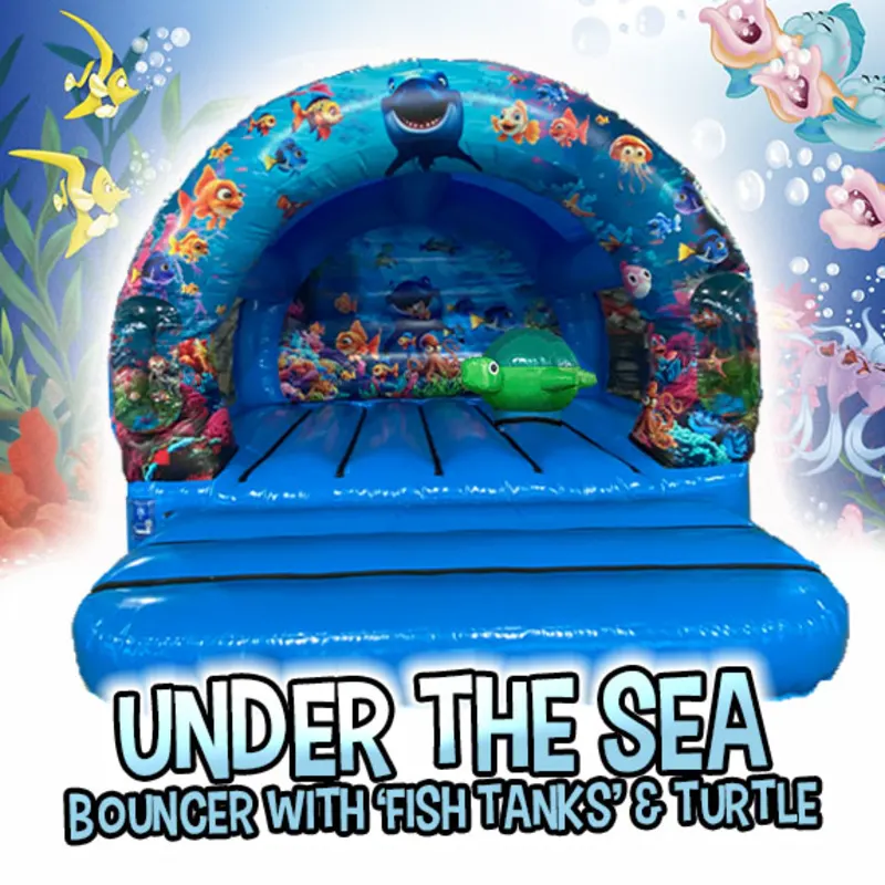 This is a brand new design and concept. Our 'Under The Sea' bouncy castle has two 'fish tanks' situated on the front pillars of the inflatable (see images) When the bouncy castle is inflated the air inside makes the fish move and so they look like they are swimming. As well as this there is a pop-up turtle that the children will love to sit on for a truly under the sea experience.